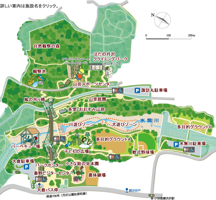お茶室など、公園の北側のエリアや山岳スポーツセンター、はだの丹沢クライミングパーク利用時に便利です。詳しくはアクセス・駐車場のページをご覧ください。