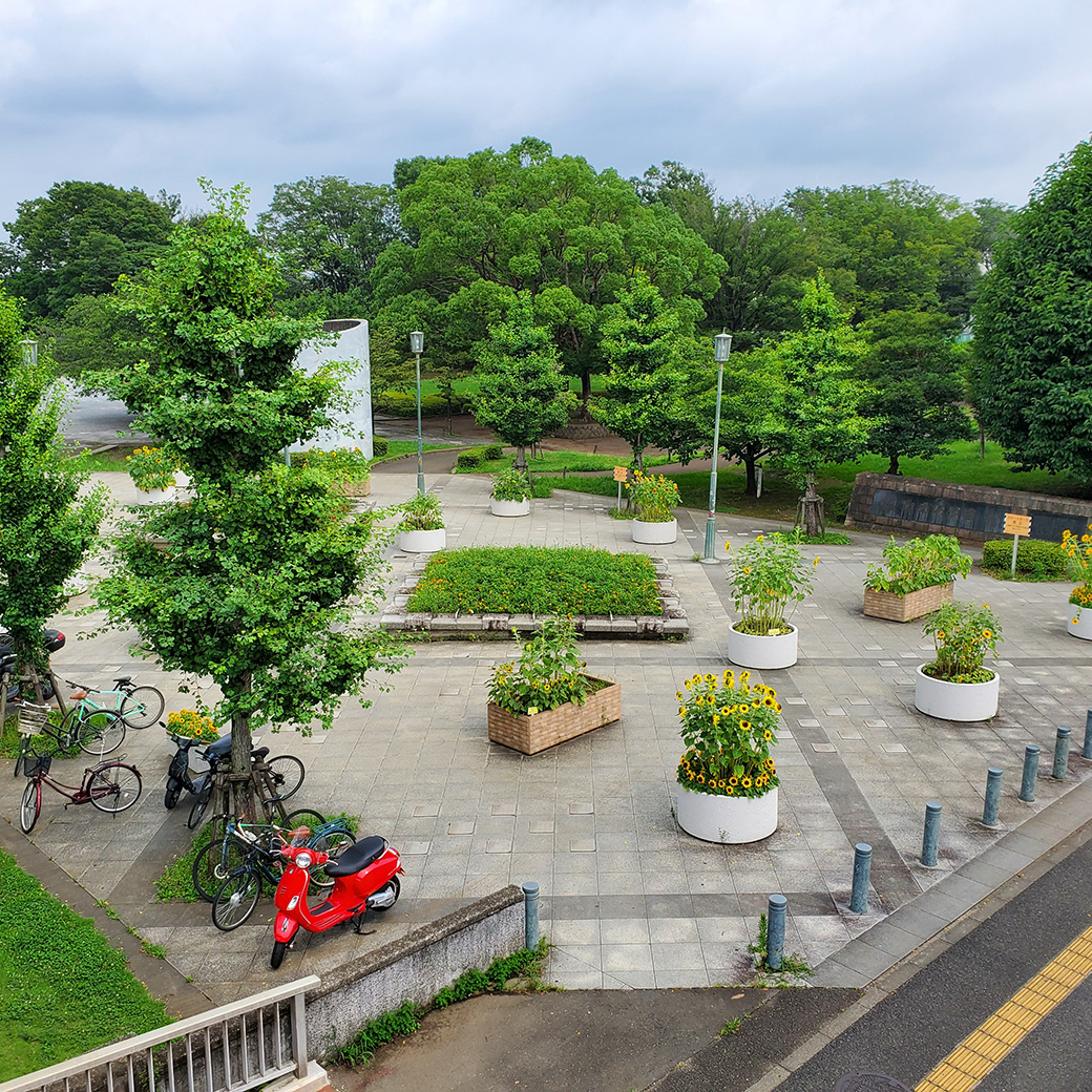 草の広場・中央広場・芝生広場の3つの広場と、季節の花が植えられているウェルカムガーデンがあり、休日になると多くの家族で賑わいます。