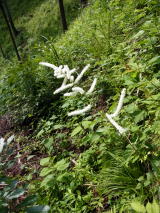 | _/_/_/_/_/_/_/_/_/_/_/_/_/_/_/_/_/_/_/_/_/_/_/_/_/_/_/_/_/_/_/_/_/_/_/_/_/_/_/_/_/_/_/_/ S=さえずり C=地鳴き V=目視 ◎見頃 ↑これから見頃 ↓見頃過ぎ ************************************************************************** 2012年 6月30日(土) 晴 宮ヶ瀬 ************************************************************************** ○早戸川林道〜汁垂橋 花:ホタルブクロ、ヤマハタザオ、ツユクサ、オニタビラコ、クサノオウ、 クマノミズキ、ママコノシリヌグイ、マタタビ など 実:オニグルミ、フサザクラ、ヘビイチゴ、ミミガタテンナンショウ など 鳥:ホトトギス、トビ、ヒヨドリ、コゲラ、シジュウカラ、エナガ、ウグイス, ハクセキレイ、ガビチョウ など ![]() クサノオウ ************************************************************************** 2012年 6月29日(金) 曇 宮ヶ瀬 ************************************************************************** ○春の木丸ハイキングコース 鳥:ホトトギス、キビタキ、ヤブサメ、サンショウクイ、トビ、ヒヨドリ、コゲラ、シジュウカラ、エナガ、 ヤマガラ、ハクセキレイ、カワラヒワ、カケス など その他:アナグマ、ニホンリス、ニホンジカ(足跡)、オトシブミ など ※台風4号の影響で春の木丸コースは山頂より北側が通行止めとなっております。 通行止め箇所以外にも枝などが落ちている箇所がありますので、 足元には十分にご注意ください。 観光案内所の裏の排水溝 オトシブミ にアナグマが!! ************************************************************************** 2012年 6月26日(火) 曇のち晴 北丹沢 ************************************************************************** ○山伏峠(約1,200m)〜菰釣山(1348.2m)〜西沢林道(約900m) 梅雨の晴れ間の真っ青な空もと、みずみずしい北丹沢の森を歩きました。 エゾハルゼミのにぎやかな声、大木に巻きつくツルアジサイなど、ブナ林の自然を 感じることができました。 ![]() ツルアジサイ ハンショウヅル ミヤマナルコユリ 苔むす木々 と キノコ 花:アカショウマ、フタリシズカ、ギンリョウソウ、ツルアジサイ、ウツギ、ツクバネウツギ(終)、 マメグミ、ヤブデマリ、ツルマサキ(つぼみ)、セイヨウタンポポ、ヤマボウシ(つぼみ)、 オオミヤマガマズミ(↓)、ヤマツツジ、ミヤマナルコユリ、ツクバネソウ、 ミヤマイボタ(つぼみ)、スノキ、ヤブウツギ(終)、ミヤマクマザサ、クワガタソウ、 ツルシロカネソウ、イワセントウソウ、タニギキョウ、ハンショウヅル、 コミネカエデ、カマツカ(↓)、フジ(落下)、ミヤマハハソ、サルナシ、ウツギ(つぼみ〜見頃) クロカンバ(終)、タムラソウsp(つぼみ)、オオバアサガラ、サワギク、キクムグラ 鳥:オオルリ、ソウシチョウ、アオバト、キビタキ、ウグイス、ヤブサメ、ホトトギス、ヒガラ、 クロツグミ、エゾムシクイ、ゴジュウカラ、オオルリ、メジロ、シジュウカラ、カケス 獣:ニホンリス(V)、ニホンジカ(足跡、食痕、声)、イタチ類(フン) 虫:エゾハルゼミ、ヤマキマダラヒカゲ、ミスジチョウ、アカタテハ、カラスアゲハsp **台風4号の影響で登山道や林道が荒れているところがあります。** お気をつけください。 ![]() ↓ ・「大棚ノ頭」から菰釣山方面へ5分ほどの所(鉄塔付近)で登山道が崩壊しています。 脇を通行できますが要注意です。 ・「ブナ沢乗越」〜西沢終点は台風4号通過以前から荒れ、すべりやすい箇所等あります。 ・西沢林道は台風4号通過以前から崩落箇所が多数あり、徒歩では終点まで通行できますが、 車通行はできません。 ************************************************************************** 2012年 6月24日(日) 曇 宮ヶ瀬 ************************************************************************** ○早戸川林道(VC〜2号橋)・宮ヶ瀬周辺 花:クマノミズキ(咲き始め)、タケニグサ(咲き始め)、マタタビ、ホタルブクロ、オオルリソウ、 アカショウマ、ヤマタツナミソウ、ナツノタムラソウ、ヨウシュヤマゴボウ、フジキ など ![]() クマノミズキ ヨウシュヤマゴボウ フジキ 虫:フクラスズメ(幼虫)、マイマイガ(幼虫)、カノコガ、キチョウ、スジグロシロチョウ、 コフキゾウムシ、オオヒラタシデムシ(幼虫・成虫)、ヤマトシジミ など 鳥:ホオジロ、ヒヨドリ、センダイムシクイ、ヤブサメ、ホトトギス、イワツバメ、ツバメ、 ハクセキレイ など ************************************************************************** 2012年 6月24日(日) 曇 宮ヶ瀬 ************************************************************************** (ガイドウォークに来られた方からの情報です。) ○春ノ木丸トンネル、親水池周辺 花:フジキ、マタタビ 鳥:トビ、ヒヨドリ、カワセミ、ホトトギス(S)、ウグイス(S) その他:カタツムリ(フジキの木についていた)、アオイトトンボ、イトトンボ、ムギワラトンボ ************************************************************************** 2012年 6月24日(日) 曇 宮ヶ瀬 ************************************************************************** (自然観察に来られた方からの情報です。) ○ビオトープ、親水池付近 鳥:ホトトギス(S)、ウグイス(S)、センダイムシクイ(S)、ヒヨドリ、ホオジロ、カルガモ トビ、イワツバメ