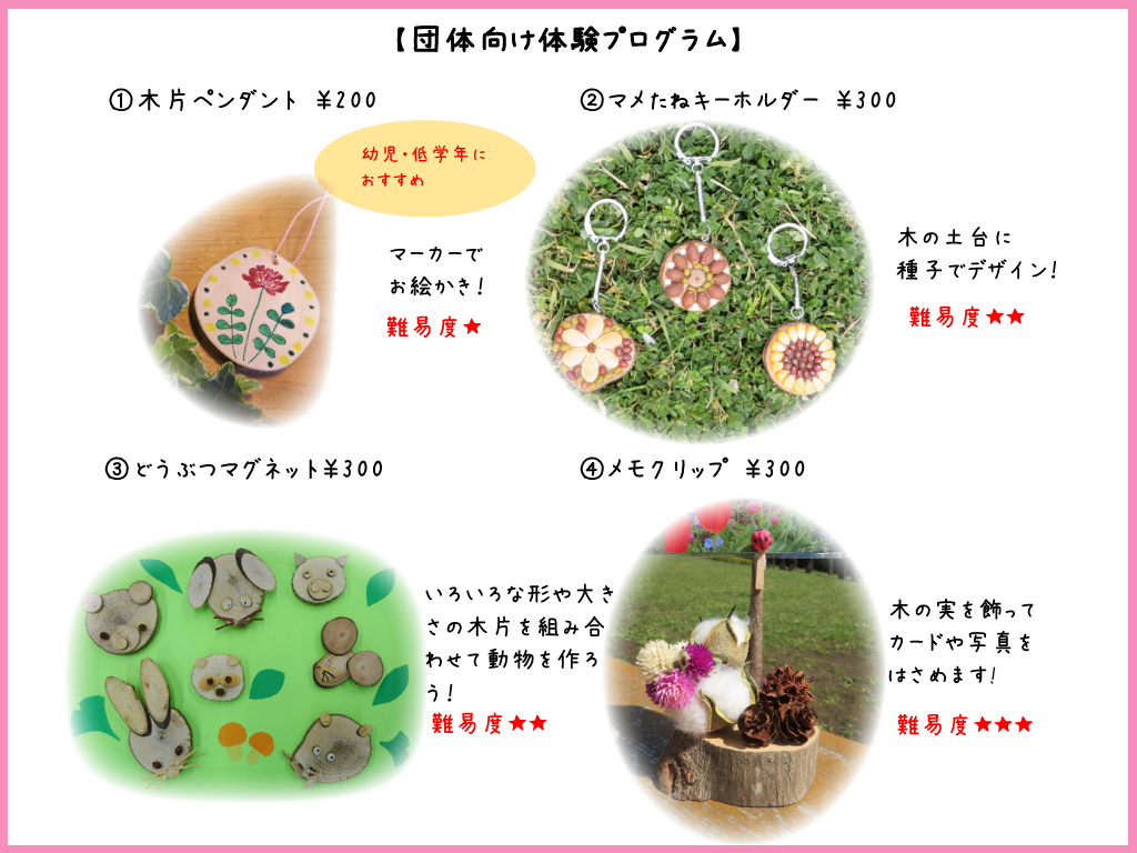 クラフト体験は団体様でご利用できるプログラムも用意しております。研修棟での実施になりますので、雨の日もご利用できます。是非ご検討の程、ご活用ください。