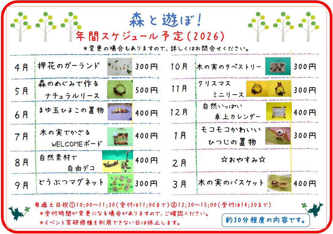 毎月テーマが変わり、季節にあわせたクラフト体験がお楽しみいただけます